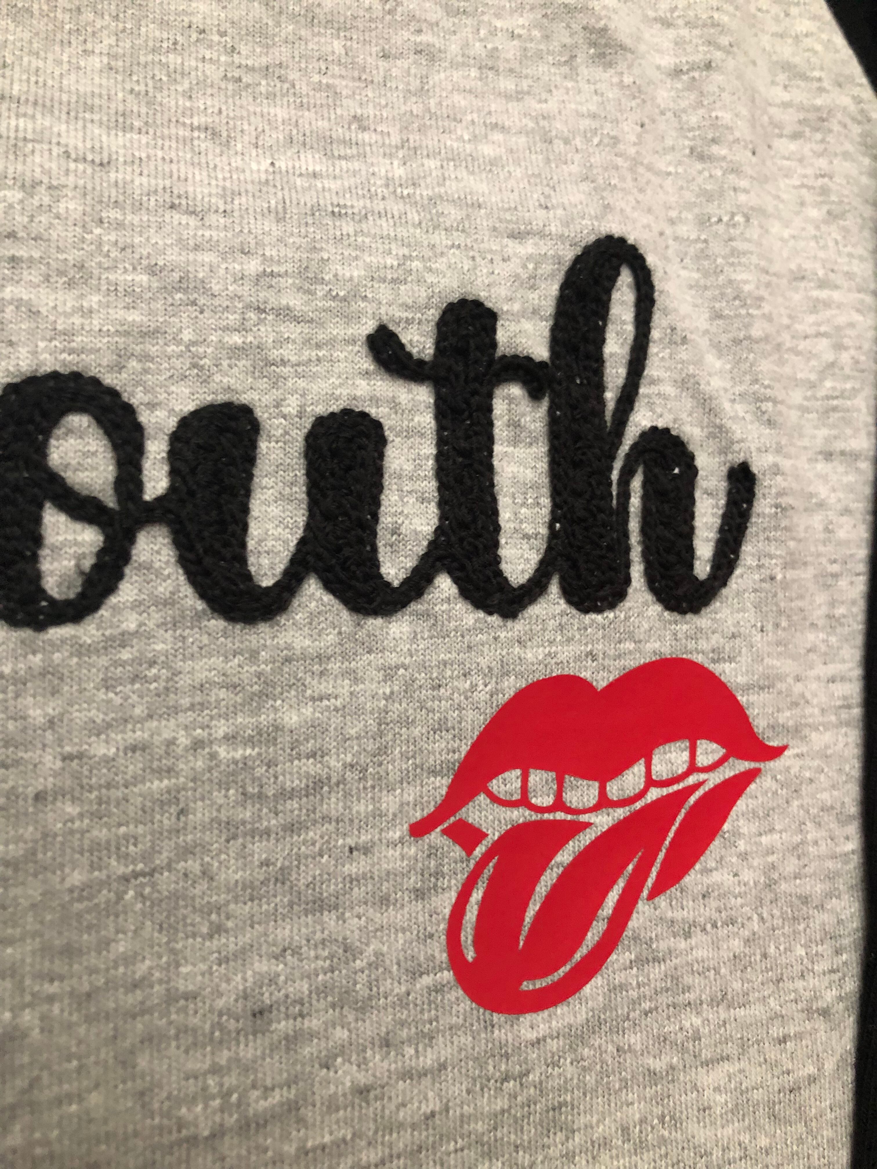フロントにチャーンステッチと転写プリント仕様になっております!